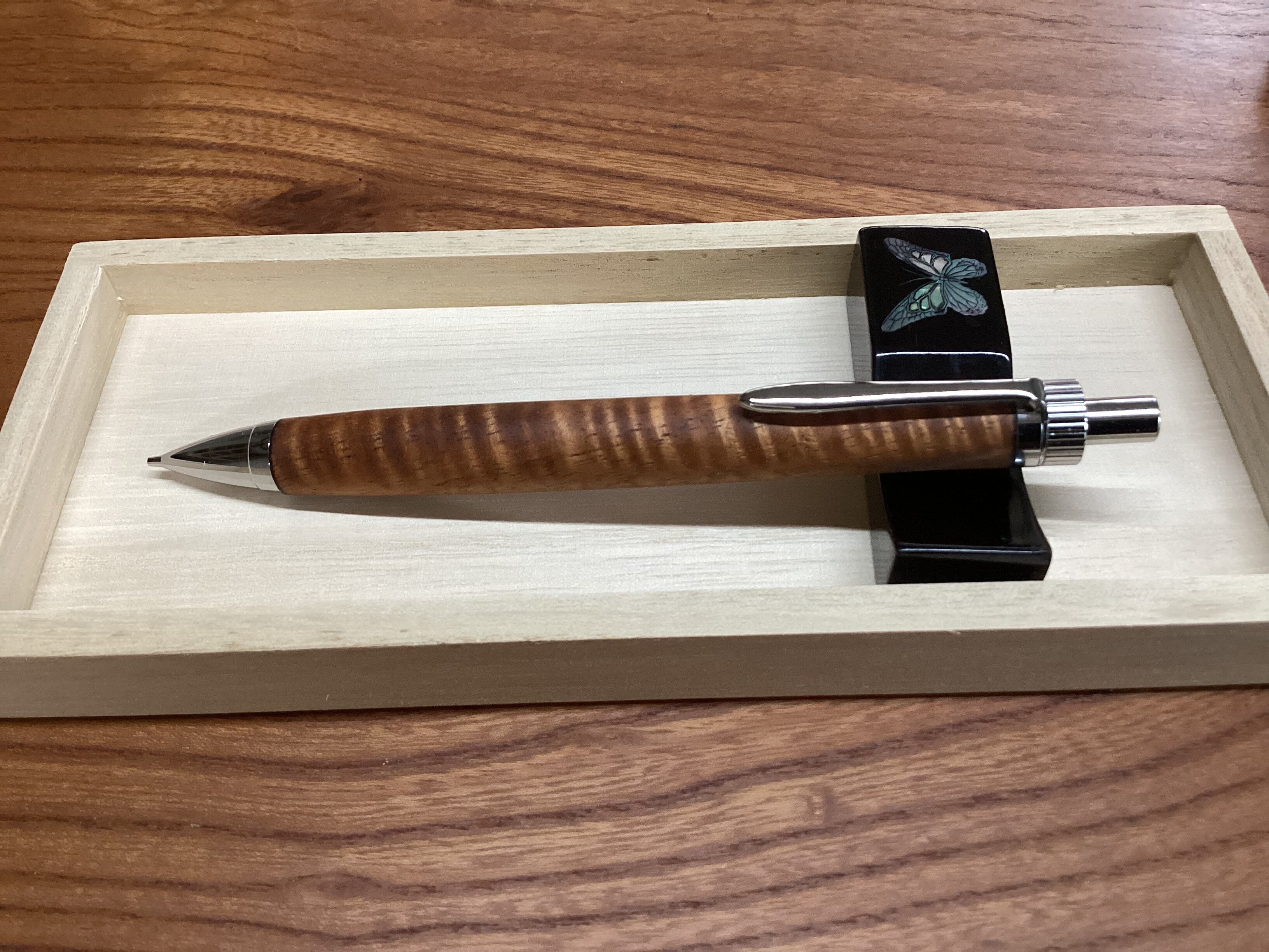 ハワイアンコアの素材で製作致しました、ハワイアンコア・カーリーのシャープペンシルです。独特の美しいカーリーバーン(うねり模様)が魅力的です。